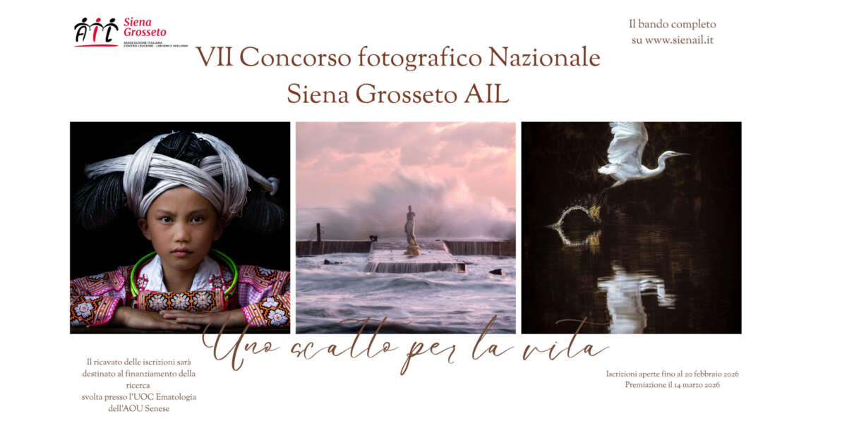 Torna, per il settimo anno, il concorso fotografico nazionale Siena Grosseto AIL “Uno scatto per la vita”. Il concorso nasce ed ha come unico scopo quello di raccogliere fondi per finanziare progetti di ricerca svolti presso il reparto di Ematologia dell’ospedale Santa Maria delle Scotte di Siena. Il concorso è aperto a tutti gli appassionati […]